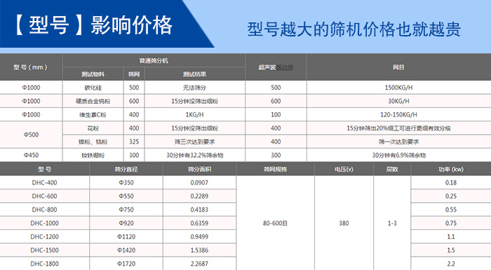 超聲波篩分機型號有:DHC-400、DHC-600、DHC-800、DHC-1000、DHC-1200、DHC-1500、DHC-1800、DHC-2000等八種標準直徑型號;不同型號的超聲波篩分機的價格就是不同,其中影響型號的的因素有:篩網(1—5層)、材質(不銹鋼、碳鋼)、振動電機(功率不同)等。